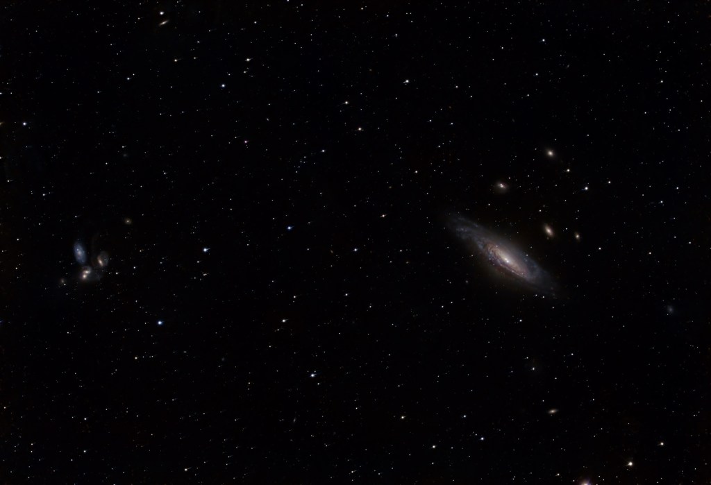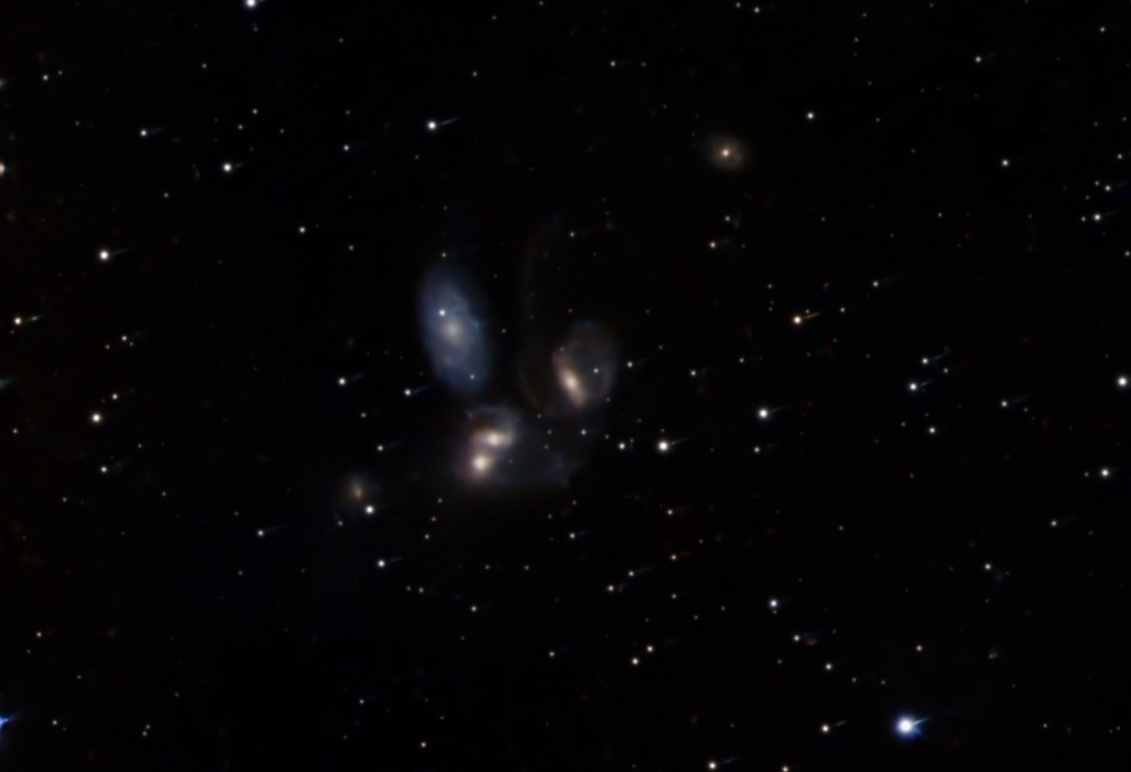 I always separate the stars and primary target for processing anyway and that largely addressed the bloated stars. I made extensive use of SetiAstro’s Blemish Blaster tool to address the star spikes. Finally, I needed to control the brightness of the galaxy core to show the supernova. I accomplished this through the use of range masks and many small stretches. The goal was to pull out detail in the small galaxies of the Stephan’s Quintet(below) while still allowing the supernova to be clearly visible. I’m really happy with how that worked out.