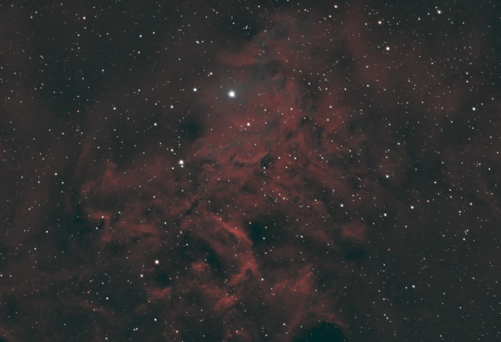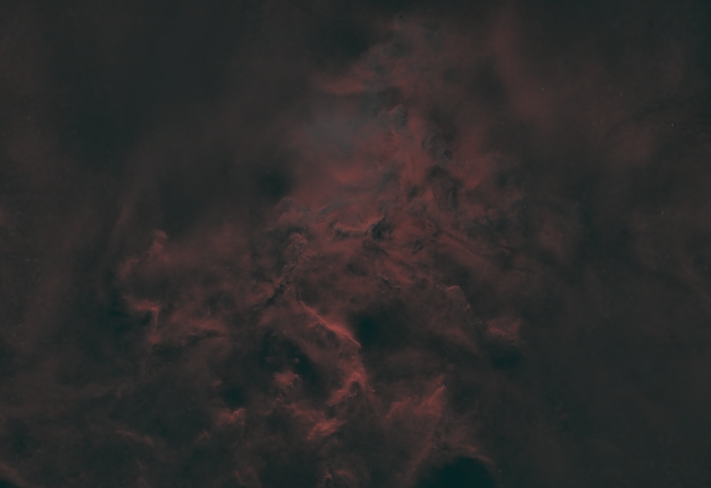 After shooting the Flaming Star and Tadpole Nebulas together in a wider field shot a few weeks ago, I decided to return and capture the Flaming Star solo in a tighter shot. It’s been a bit chilly here, and my equipment wasn’t fully cooperative, but I managed to get about 4.5 hours on it, which is enough for what is a relatively bright object. I’m going to return to this data in a bit, because I’m not fully satisfied with the outcome, but I’ll share a few in process photos. The photo above is a reprocess into the HOO palette. As part of the process of generating that photo, there are some intermediate steps, or easy forks that I also thought looked nice.
