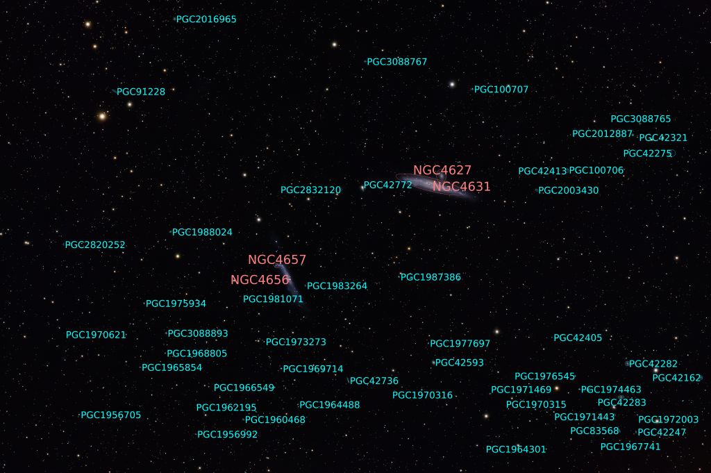This is an amazingly galaxy dense region of the sky. The PGC galaxy catalogue doesn’t identify most of the visible galaxies. I suspect there are several hundred visible. I’ve been struggling with how to annotate them is some reasonable fashion that actually conveys information.