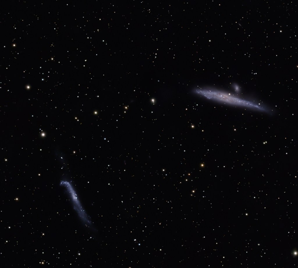 An interestingly shaped grouping of galaxies, the Whale Galaxy (NGC 4631) is a barred-spiral galaxy viewed edge on from earth. This is the same classification as the Milky Way, and about 30 million light years distant so it gives us a way to observe a similar galaxy from a different angle. It has a small companion dwarf galaxy, NGC 4627.