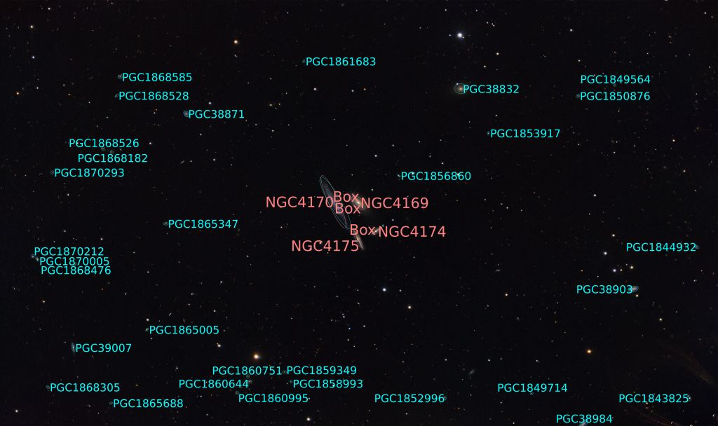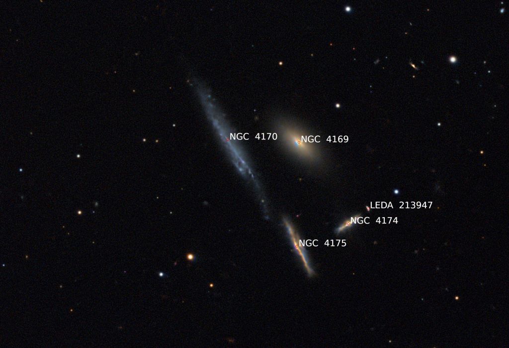 Clearly from the above data, NGC 4170 is not a true part of the galaxy group, but it is likely that the other three are at least local group members, although there is no evidence they are interacting. Nearby 4174 is LEDA (PGC) 213947, another only apparently close galaxy, as its redshift distance puts it at over 1Bly away.