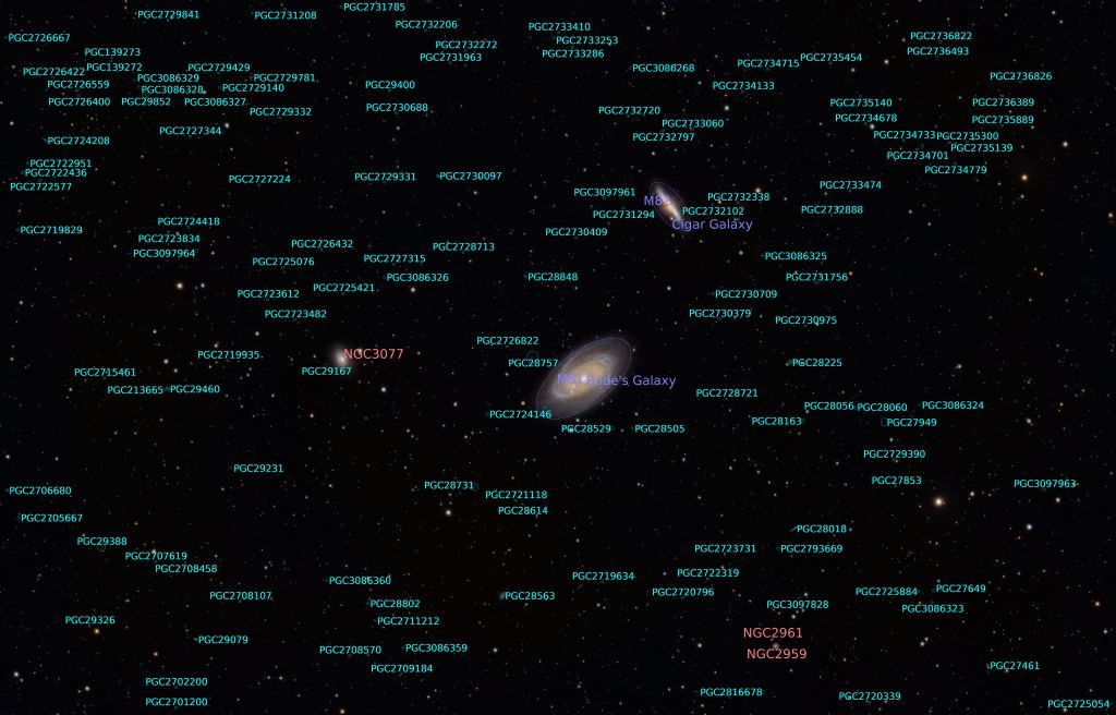 NGC 3077 is a disrupted eliptical galaxy, interacting with the group, probably disrupted by M82.