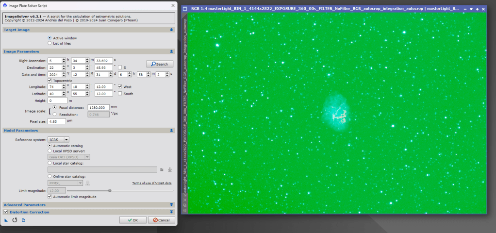 Open the stacked image and apply the auto stretch. The image will be very green at this point. Image Solver Script to attach an exact astrometry solution to the image. If you’ve set up your capture software correctly, this tool should run with just the defaults.