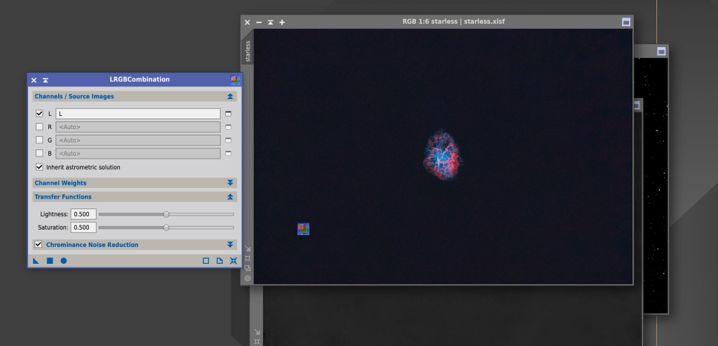 To use the LRGB Combination, set it up like shown in the below image. Uncheck RGB, have L point to the luminance file, inherit the astronomical solution, and I usually reduce the chrominance noise. Then you can simply drag the small blue triangle over the starless image to apply.