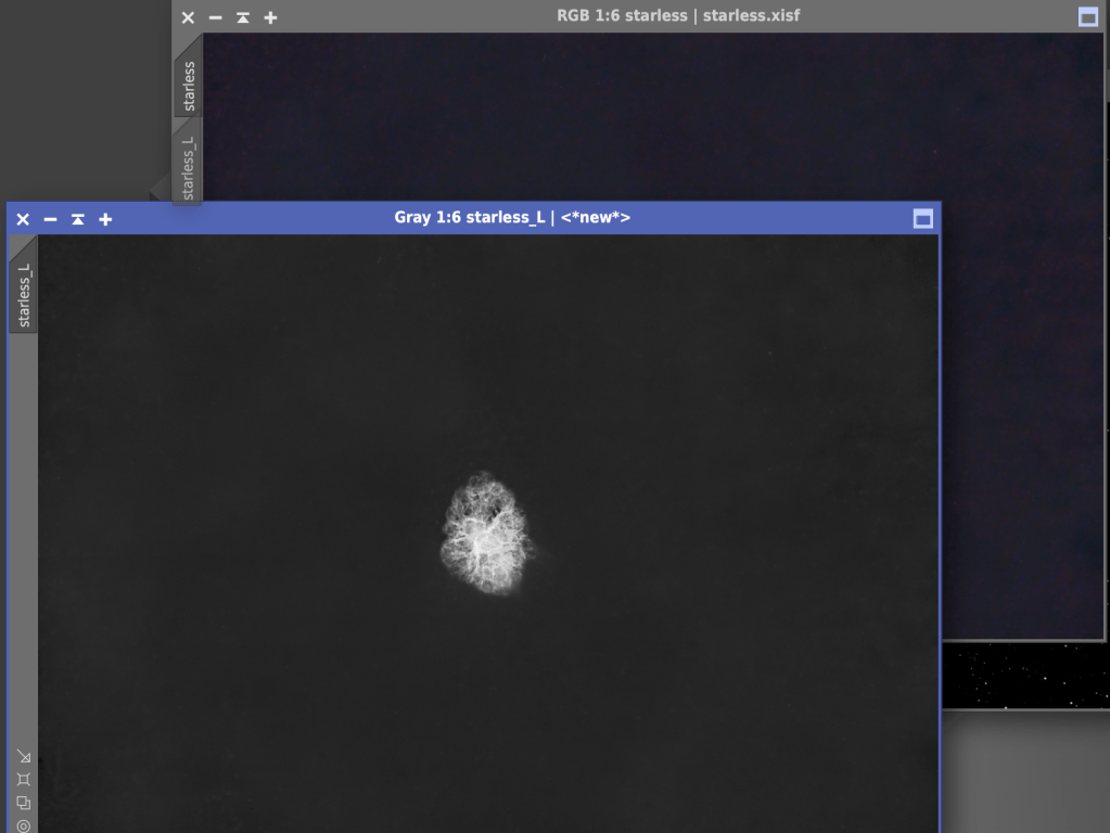 The next part is straightforward and invariably the defaults on these tools are acceptable. If you look closely at my image, my backfocus was slightly off, and the stars at the edges get a little bit of a vortex effect. BlurXterminator cleans this up nicely, as well as shrinks the stars a little bit. I run this twice, first in “correct only” mode, and then in standard mode. Then I use StarXterminator to remove the stars, making sure to check the “screen stars” & “generate star image” boxes. This is where StarNet++ could also be used as acceptable alternative. You will now have a starless and star image.