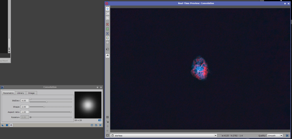 This is one of key steps in my workflow, and it is a little counter intuitive. When we look at images, our eyes rely heavily on color to distinguish features. In PixInsight, we use the LRGB combination tool to merge the luminance with color image, it will use the luminance to define the brightness and features, and use the color to “paint” the image. We can take advantage of this, to apply the noise reduction and sharpness to the luminance, then slightly blur the color image, and use it to color the denoised features in the luminance layer. It’s a little counterintuitive, but this technique works best if the color image is blurred, so we’ll use the convolution tool, usually I crank it up to about 4, as shown below.
