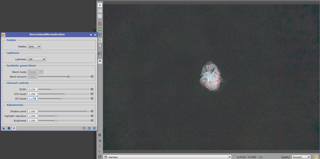 The starless image is the most complicated to get right. At this point you can use the Narrowband Normization tool. For this image I chose the SHO palette, with a little green channel reduction, and some boost for the OIII and SII. Use the preview window (open circle button) to adjust to your taste, this applies for pretty much every tool going forward. Use of the Narrowband Normalization tool is not necessary. Most emission nebulas tend to be pretty red, and I captured this image with a dual narrowband filter, which further emphasis redness. Narrowband Normalization tool gives you some options for creating false color images in standard palettes to separate the effects of the different gases. Sometimes I like the effect, sometimes I don’t, sometimes I prefer the blue and gold, other times the blue and red…there isn’t a wrong answer really, it’s all a personal preference. When you are happy with the result shown in the preview, commit the change with the square button and move on to the stretch.