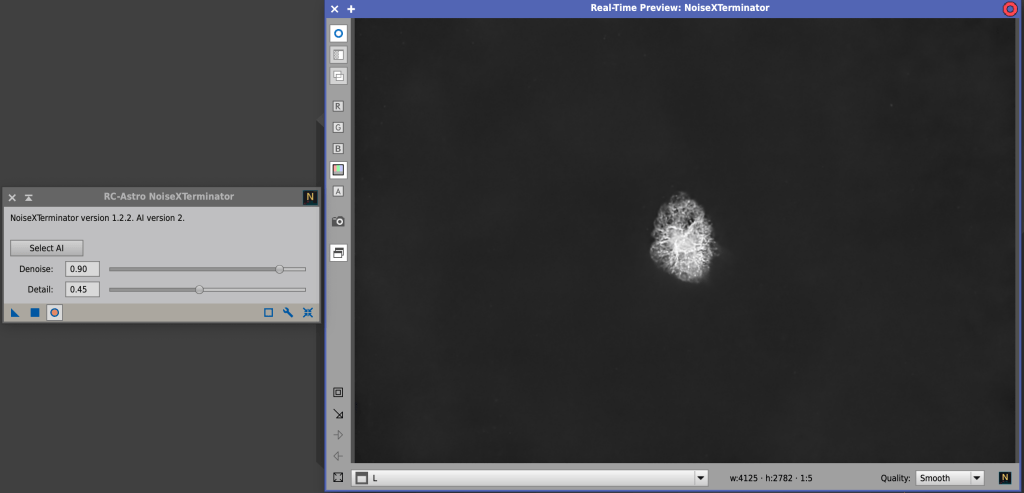 For the starless image I prefer the GHS strech tool. Another good choice is the Seti Astro Statistical Stretch tool. This tool does and automated stretch, and is quite good, although I usually clean up a little bit after using it. There are many videos and tutorials on stretching so I won’t really cover it here. Then use the curves tool to adjust the saturation. You can overcook the saturation a little bit in this step, because when we do noise reduction the saturation will get knocked back down.
