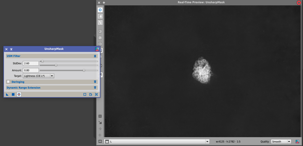 I find the Unsharp Mask tool to be very aggressive, sometimes I skip it, but if I apply it, I usually use no more than 3.5 in the StdDev. Apply that and move on to LRGB Combination.