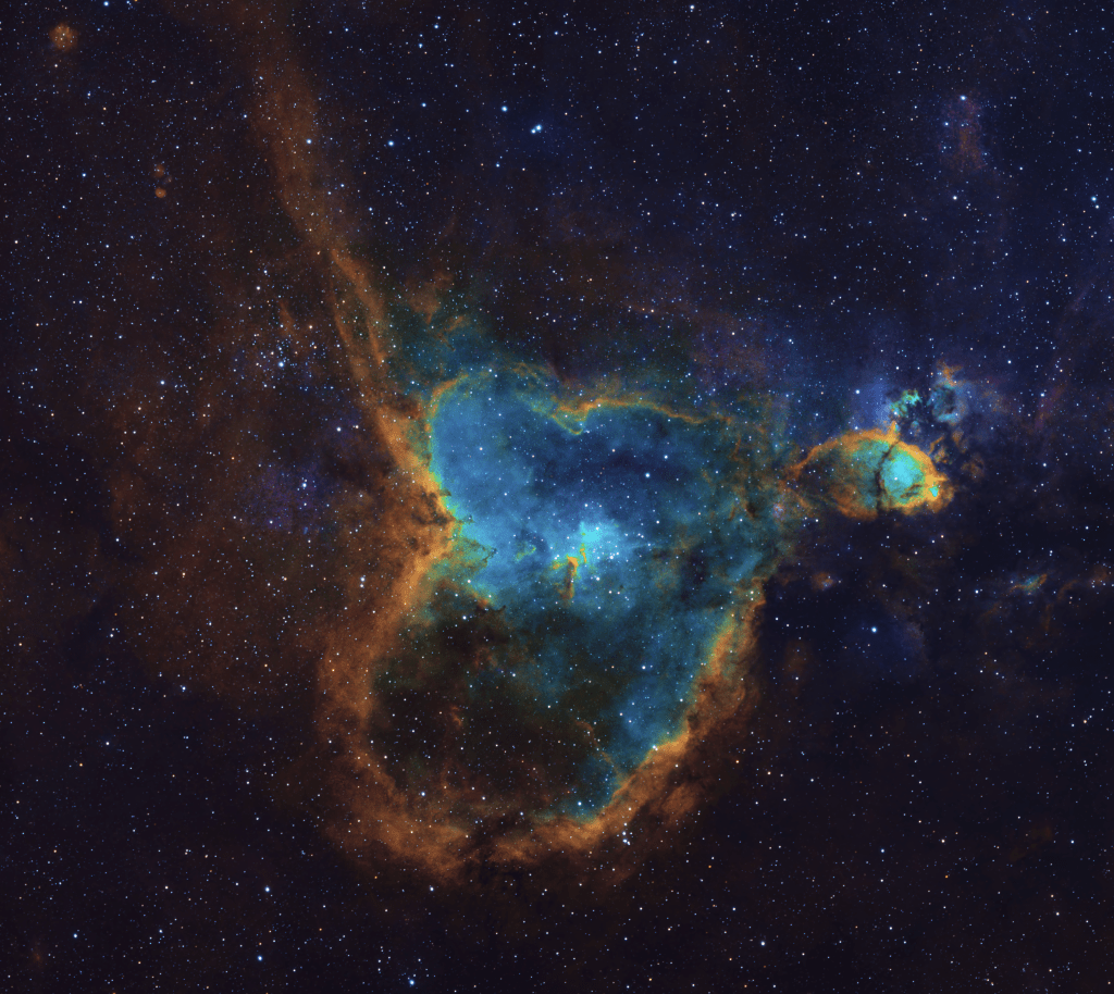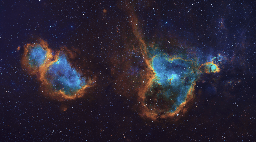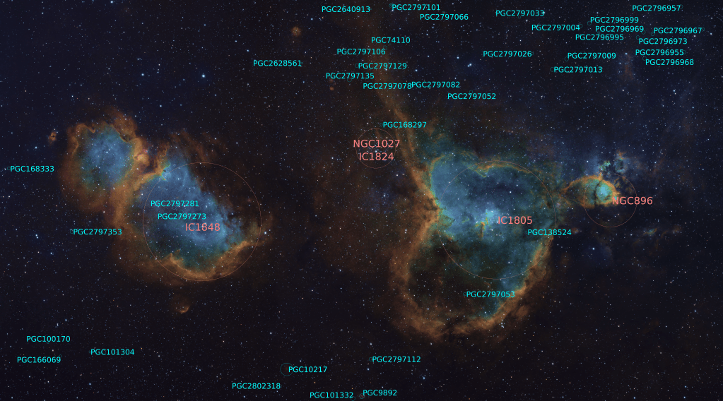 The Heart and Soul Nebula is a star forming region in Cassiopeia, consisting of many named and separately designated objects. This area is rich in Ha, OIII, an SII gases and is a popular narrowband target.